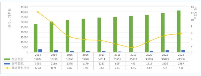2022年,全國風電新增並網裝機3763萬千瓦。截至2022年底,全國風電累計裝機容量達36544萬千瓦,同比增長11.2%,連續13年穩居世界首位。其中,陸上風電累計裝機3.35億千瓦、海上風電累計裝機3046萬千瓦。