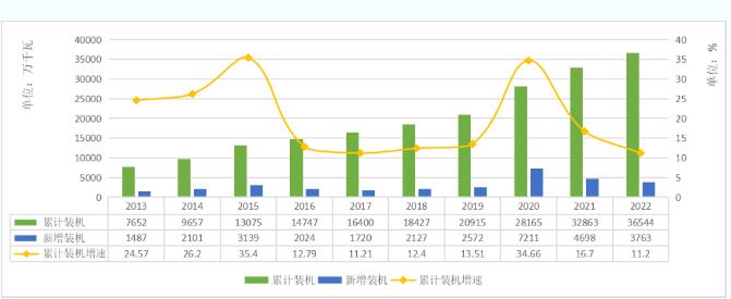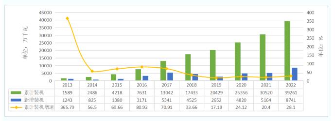 圖6-12 2013—2022年太陽能發電裝機及增速