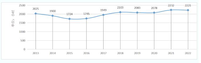 圖6-10 2013—2022年6000千瓦及以上風電設備利用小時數