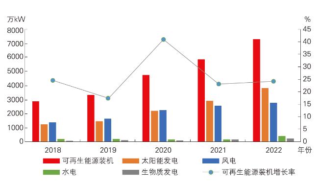2018—2022 年河北省可再生能源裝機容量及增長率變化對比
