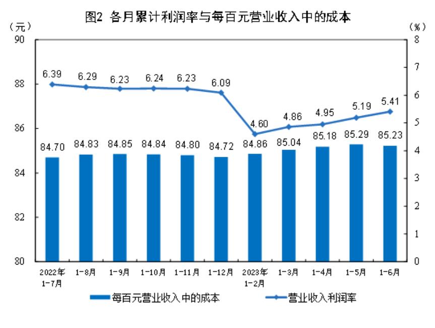 1—6月份,規模以上工業企業每百元營業收入中的成本為85.23元,同比增加0.81元;每百元營業收入中的費用為8.34元,同比增加0.25元。