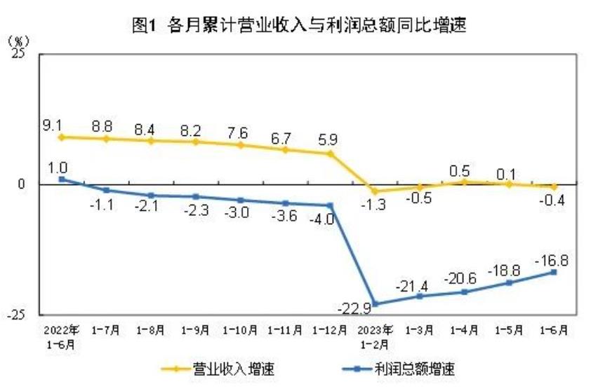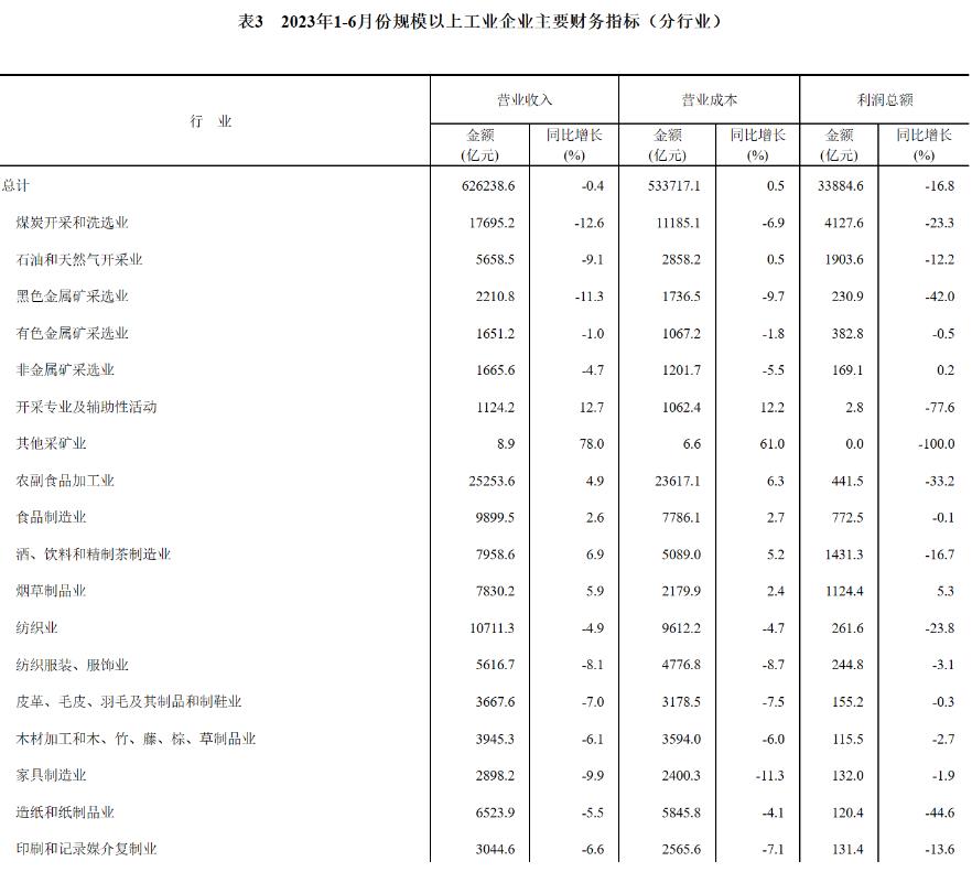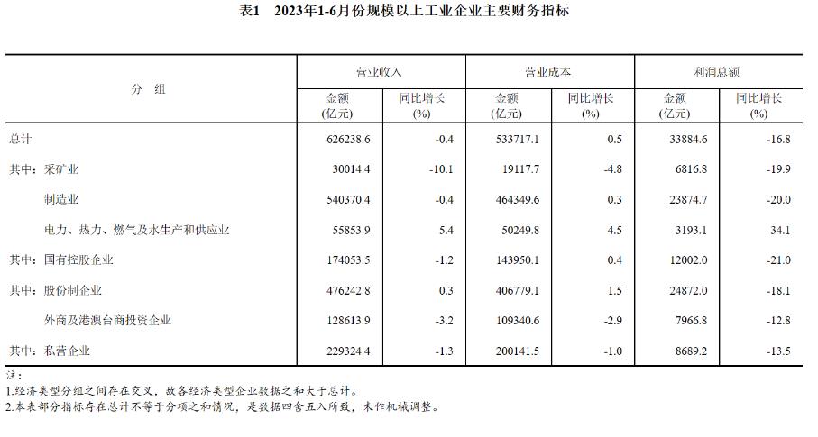 1—6月份,全國規模以上工業企業實現利潤總額33884.6億元,同比下降16.8%,降幅比1—5月份收窄2.0個百分點(按可比口徑計算,詳見附注二)。