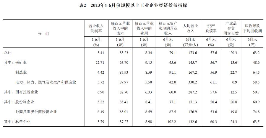 6月末,規模以上工業企業每百元資產實現的營業收入為79.1元,同比減少6.2元;人均營業收入為173.6萬元,同比增加5.1萬元;產成品存貨周轉天數為20.3天,同比增加1.1天;應收賬款平均回收期為63.2天,同比增加6.4天。