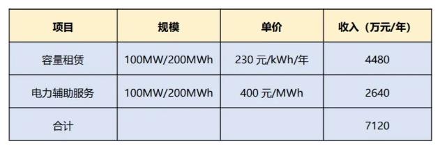 電力輔助服務收益方麵,電網公司按照每次調用規模及調用次數,向儲能電站支付費用,按照上述條件,預計一個規模100MW/200MWh的儲能電站的電力輔助服務收入(含稅)約為2640萬元/年。