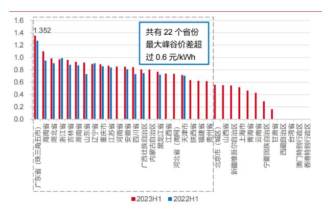 我國工商業普遍實行分時電價政策和尖峰電價政策。2021年7月,國家發展改革委發布《關於進一步完善分時電價機製的通知》,要求係統峰穀差率超過40%的地方,峰穀電價價差原則上不低於4:1,其他地方原則上不低於3:1,尖峰電價在峰段電價基礎上上浮比例原則上不低於20%,峰穀價差拉大,為用戶側儲能大規模發展奠定了基礎。2022年底,各省市相繼出台完善分時電價機製相關政策,加強峰穀電價價差。2023年,我國工商業電價的調整讓工商業經濟性得以大幅提升,具體包括峰穀價差拉大、時段調整等。據統計,2023年上半年我國共有22個省份最大峰穀價差超過0.6元/kWh,大部分省份的峰穀價差相較於去年同期持續拉大。最大峰穀價差位列前五的省份分別是廣東省(珠三角五市)1.352元/kWh、海南省1.099元/kWh、湖北省0.985元/kWh、浙江省0.970元/kWh、吉林省0.961元/kWh。