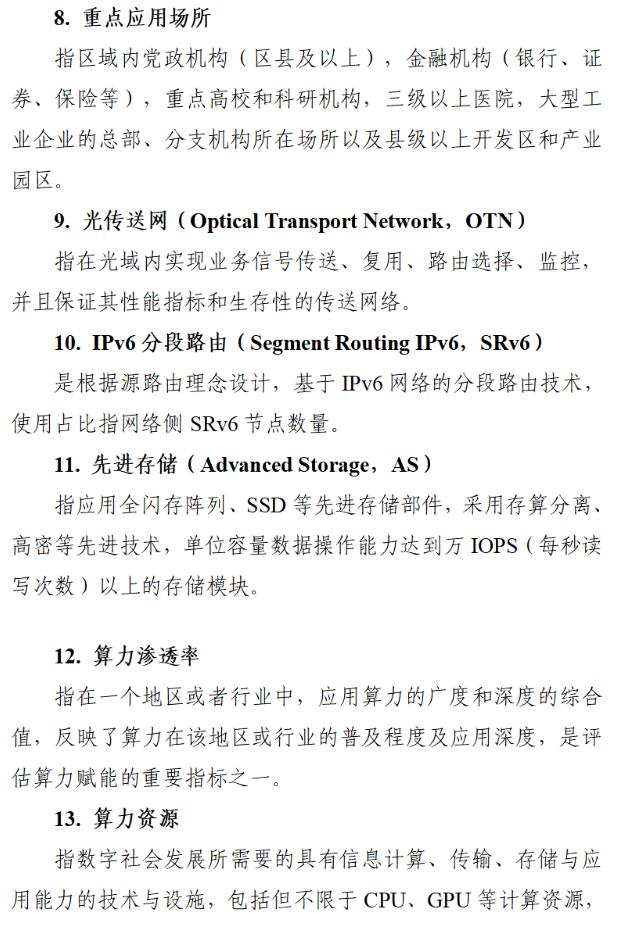 3. 提升樞紐網絡傳輸效率。推動算力網絡國家樞紐節點直連網絡骨幹節點,逐步建成集群間一跳直達鏈路,國家樞紐節點內重要算力基礎設施間時延不高於5ms。推動超低損光纖部署,優化光纜路由。加快400G/800G高速光傳輸網絡研發部署和全光交叉、SRv6、網絡切片、靈活以太網、光業務單元等技術應用,實現網絡傳輸智能高效、靈活敏捷、按需隨選。