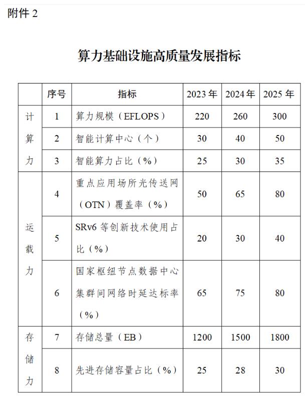到2025年,計算力方麵,算力規模超過300 EFLOPS,智能算力占比達到35%,東西部算力平衡協調發展。