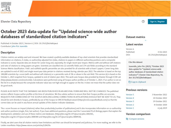 2023年10月4日,Elsevier與美國斯坦福大學John R.A. Ioannidis教授團隊聯合發布了“全球前2%頂尖科學家榜單(World's Top 2% Scientists)”。該榜單從近700萬名科學家中,基於Scopus數據庫,根據論文引用數、h指數、合著者調整的hm指數、單獨或第一作者的文章引用數等進行綜合評估,遴選出來自22個學科領域和174個細分子學科領域的世界Top 2%的科學家。該榜單旨在提供一個科學家長期科研表現的衡量指標,能夠更客觀、更真實地反映科學家的產出量和學術影響力。榜單包括“終身科學影響力榜單”(關注整個學術生涯迄今的影響力)、“年度科學影響力榜單”(聚焦2022年度的學術成就)。