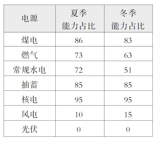 根據多年實際運行統計數據,各類電源負荷高峰期平均發電能力與裝機容量的比值如下表所示。