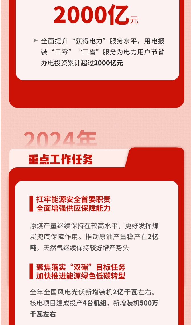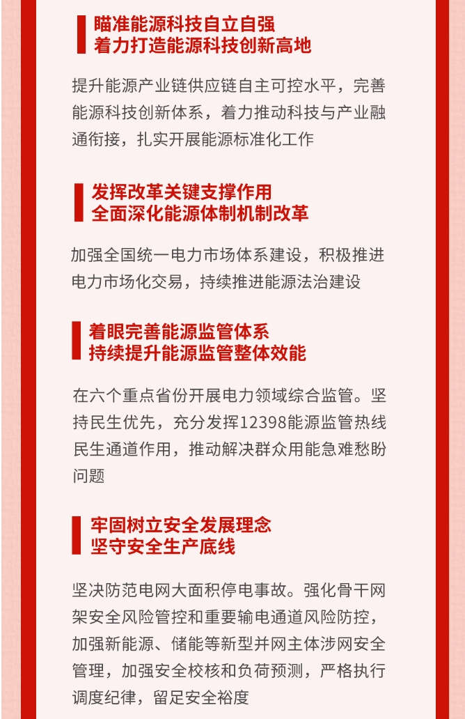 會議強調,2024年能源工作要堅持以習近平新時代中國特色社會主義思想為指導,深入落實習近平總書記重要指示批示精神和中央重大決策部署,堅持以黨的創新理論引領能源高質量發展新實踐,全麵貫徹黨的二十大和二十屆二中全會精神,深入落實中央經濟工作會議決策部署,認真落實全國發展和改革工作會議要求,全麵加強黨對能源工作的領導,堅持穩中求進工作總基調,完整準確全麵貫徹新發展理念,加快構建新發展格局,統籌高質量發展和高水平安全,深入推進能源革命,加快建設新型能源體係、新型電力係統,加強能源產供儲銷體係建設,在新的曆史起點上推動能源高質量發展再上新台階。一要扛牢能源安全首要職責,立足我國能源資源稟賦,堅持穩中求進、以進促穩、先立後破,全力抓好能源增產保供,持續提高能源資源安全保障能力。二要聚焦落實“雙碳”目標任務,持續優化調整能源結構,大力提升新能源安全可靠替代水平,加快推進能源綠色低碳轉型。三要瞄準能源科技自立自強,深入實施創新驅動發展戰略,完善能源科技創新體係,著力推動科技與產業融通銜接,紮實開展能源標準化工作,提升能源產業鏈供應鏈自主可控水平,著力打造能源科技創新高地。四要發揮改革關鍵支撐作用,落實關於構建全國統一大市場等有關工作部署,積極推進電力市場化交易,持續推進能源法治建設,深化能源領域體製機製改革,不斷提升能源治理能力水平。五要著眼完善能源監管體係,健全完善能源監管製度,創新開展過程監管、數字化監管、穿透式監管、跨部門協同監管,加大監管工作力度,有效維護公平公正市場秩序。六要牢固樹立安全發展理念,嚴格落實“三管三必須”,以“時時放心不下”的責任感抓好安全生產,堅守安全生產底線。七要積極加強能源國際合作,以共建“一帶一路”為引領,充分利用國際國內兩個市場、兩種資源,保障開放條件下的能源安全,全麵提升國際影響力話語權。八要大力加強民生用能工程建設,推進北方地區清潔取暖,推動農村能源清潔低碳轉型,提升電動汽車充電基礎設施水平,更好滿足人民群眾用能需求。九要全麵加強黨的建設,強化黨的創新理論武裝,落實巡視整改責任,加強基層黨組織建設,建設高素質專業化能源幹部隊伍,以高質量黨建引領能源高質量發展。